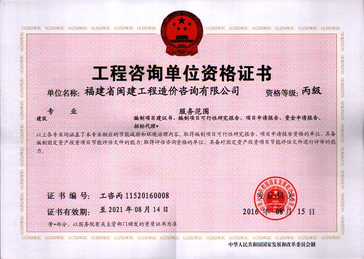 福建省閩建工程造價咨詢有限公司成立于1993年,原隸屬福建省建設(shè)委員會,2001年脫鉤改制為有限責任公司,公司注冊資本1200萬元,是一家具有甲級工程招標代理資質(zhì)(證書編號:F135000429)、甲級工程造價咨詢資質(zhì)(證書編號:甲150135000084)、政府采購代理資質(zhì)、預(yù)備級中央投資項目招標代理機構(gòu)資質(zhì)(證書編號:ZYTZ-C2013239)、丙級工程資質(zhì)(證書編號:工咨丙11520160008)的綜合性工程咨詢服務(wù)單位。能承擔各類建設(shè)項目的工程招標代理、工程造價咨詢...